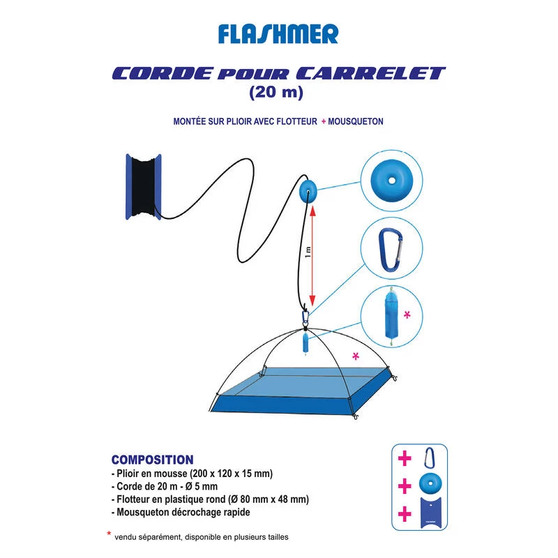 Cette corde est conçue pour utiliser un carrelet et faciliter sa remontée.Idéal pour capturer, avec un carrelet, des poissons tels que : éperlans, mulets, ardines, plies, soles, merlans, merlus, anguilles, etc.